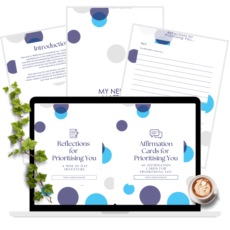 Prioritising You - Affirmation Cards and Reflection e-Journal includes 40 affirmation cards (electronic download) and an 18-page e-journal for your to reflection and track your actions for prioritising you over the 30 days.